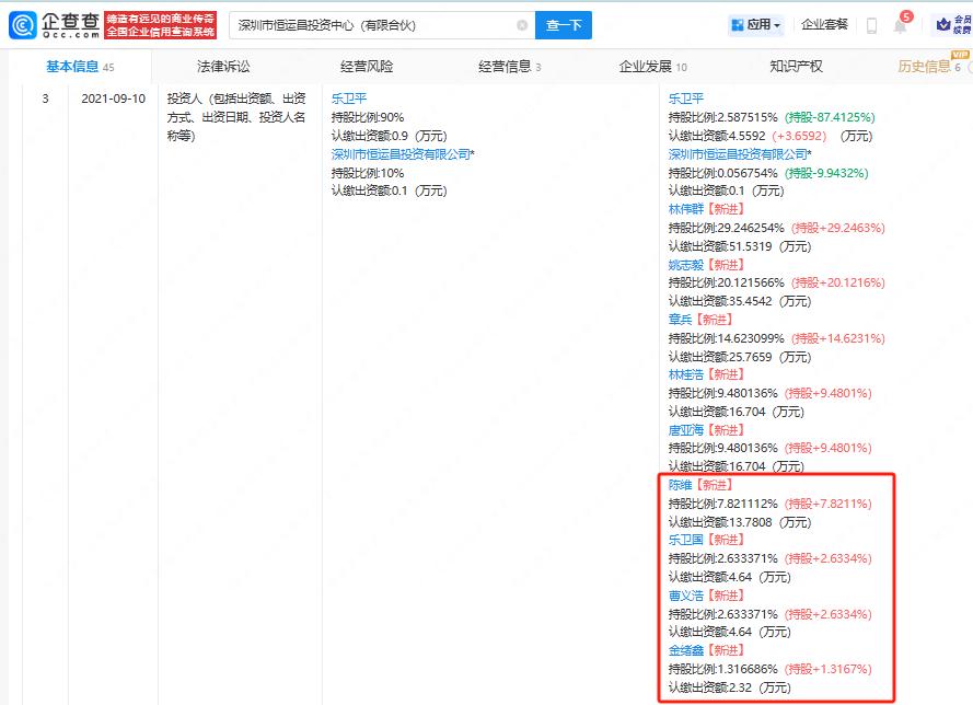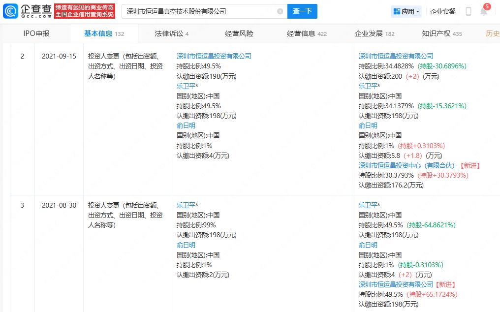 据企查查,2021年8月、9月,俞日明分别向恒运昌增资2万元和1.8万元,深圳市恒运昌投资有限公司(下称“恒运昌投资”)分别向恒运昌增资198万元和2万元,2021年9月,深圳市恒运昌投资中心(有限合伙)(下称“投资中心”)向恒运昌增资176.2万元。